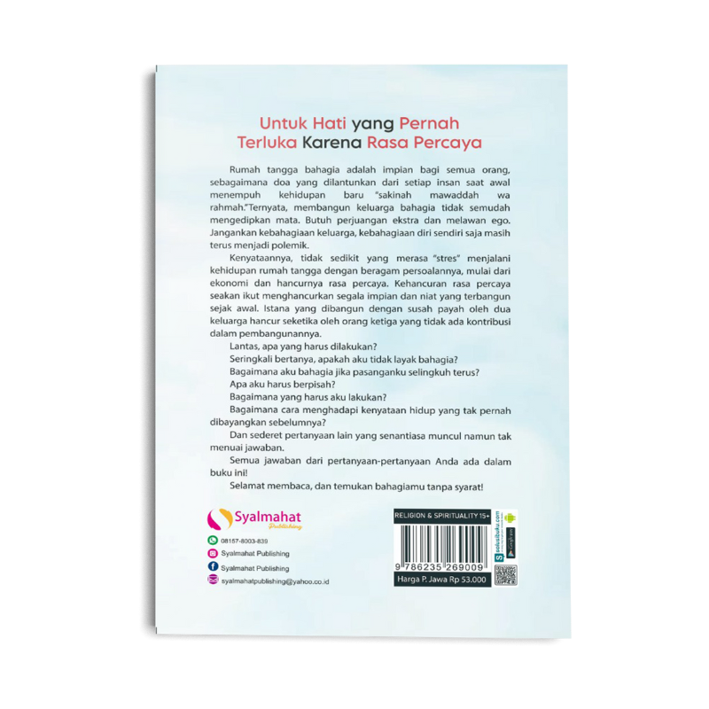 Buku Untuk Hati Yang Pernah Terluka Karena Rasa Percaya mengajak pembaca untuk jangan menyalahkan diri dan fokus membahagiakan diri sendiri. Ambillah keputusan dan berbahagialah dengan segala konsekuensi yang akan diterima.